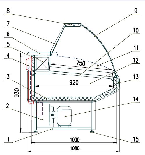 Схема холодильной витрины Двина Рис. 1а. Схема гастрономической витрины «ДВИНА 120» ВС: 1 – Подставка витрины; Работа витрины – это работа ее холодильной системы, которой управляет электронный регулятор (контроллер). Датчик температуры контроллера считывает температуру воздуха в полезном объеме витрины, при превышении заданной температуры включается компрессор (открывается соленоидный вентиль для исполнения с внешним холодильным агрегатом) и хладагент поступает в испаритель. При достижении в полезном объеме витрины заданной температуры контроллер выключает компрессор (закрывает соленоидный вентиль), прекращая тем самым поступление хладагента в испаритель. Время размораживания испарителя и его периодичность определяются настройками контроллера. Перед подключением витрины к розетке, необходимо убедиться, что напряжение питающей сети соответствует напряжению, указанному на маркировочной табличке витрины (220 В - 50 Гц - одна фаза). Для обеспечения безаварийной работы витрины необходимо, чтобы максимальное отклонение напряжения находилось в пределах от –15 до +10 % от номинального значения. Корпус холодильной витрины Двина 120 ВС включает в себя две камеры. Одна камера служит для демонстрации продукции, а вторая для временного хранения небольшого количества продуктов (Запасник). Сам корпус холодильной витрины изготовлен из оцинковки с помощью проката и штамповки. Сверху оцинковки наносится несколько слоев специального полимерного покрытия. Компрессорно-конденсаторная часть состоит из блока Испарителя, связанного с Компрессором системой трубопроводов. Внутренняя поверхность холодильной витрины Двина 150 ВС изготовлена также из оцинкованной стали с многослойным защитным покрытием. Боковины у холодильной витрины Двина 150 ВС легко снимаются, а внутри заполнены пенополиуретаном - прекрасным теплоизолирующим веществом. Электронная начинка холодильной витрины Двина 120 ВС состоит из навесного блока управления, расположенного сзади витрины, и Светильника – расположенного в самой верхней части витрины. Дополнительная комплектация холодильной витрины Двина Боковина (в сборе)